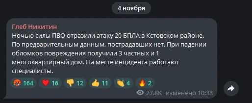 Силы ПВО отразили атаку 20 беспилотников в Кстовском районе, сообщил губернатор Глеб Никитин.