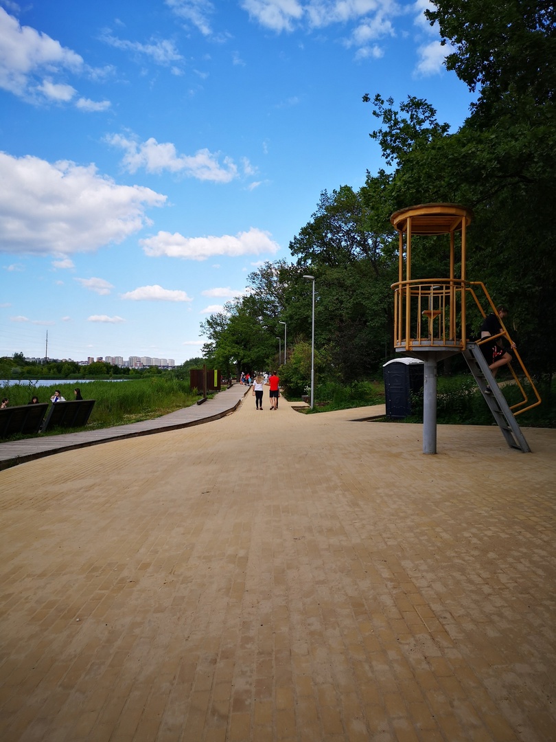 Полностью заменена дорога из экобрусчатки на участке от дамбы второго до третьего озера. На первом озере предстоит заменить экобрусчатку на асфальтовое покрытие с «карманами» для установки лавочек и урн.