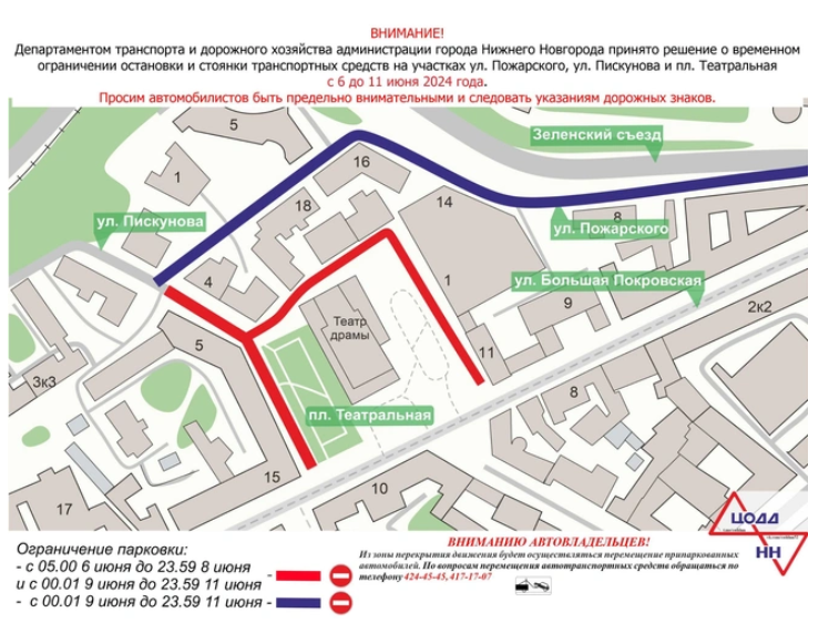 С 9 до 12 июня также планируется ограничить парковку по улице Пожарского на участке от площади Минина и Пожарского до дома № 4 по улице Пискунова, и по улице Пискунова на участке от дома № 4 по улице Пискунова до улицы Большой Покровской и дома № 1 на площади Театральной.
