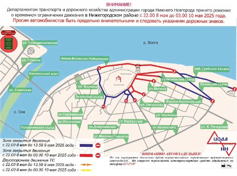 • С 14 часов 9 мая до 3 часов ночи 10 мая будет перекрыта площадь Минина и Пожарского от памятника Чкалову до улицы Варварской, а также частично улицы Ульянова, Минина, Верхневолжская и Ниженеволжская набережные.
