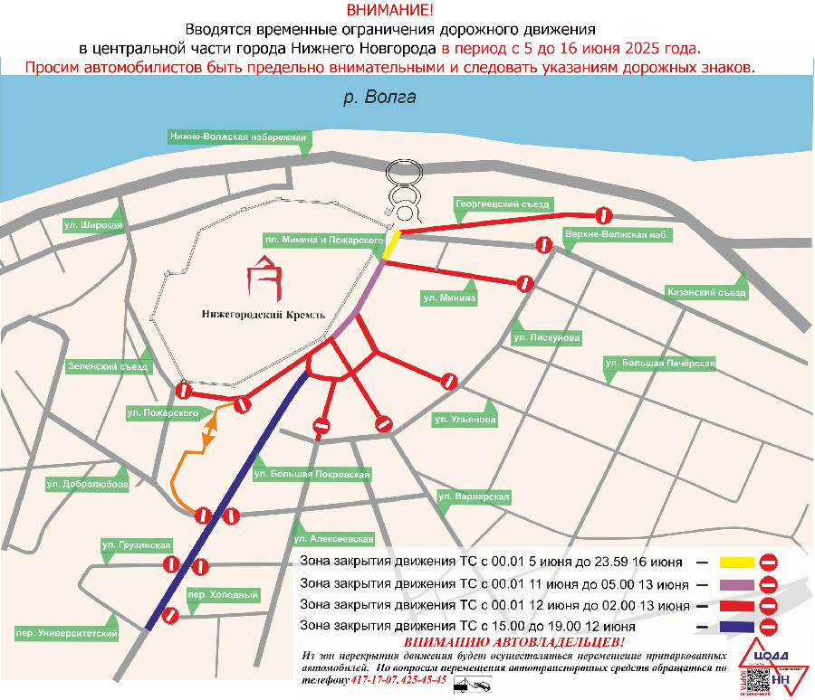 🔹 С полуночи 12 июня до 5:00 13 июня полностью закроют для транспорта площадь Минина и Пожарского, а также частично все прилегающие к ней улицы, Зеленский и Георгиевский съезды.