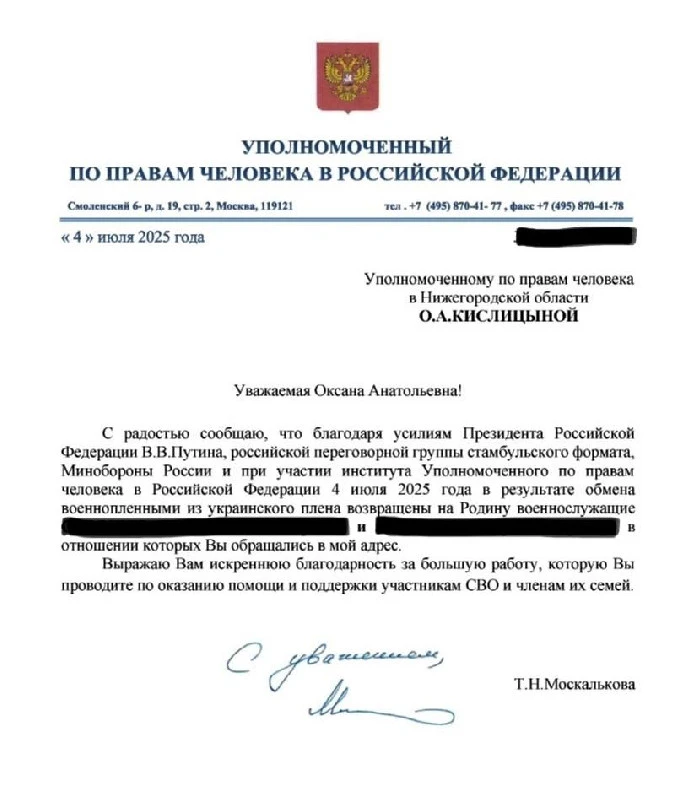 Еще два жителя Нижегородской области возвращены из украинского плена. Об этом сообщила уполномоченный по правам человека в регионе Оксана Кислицына – она опубликовала документ, присланный российским омбудсменом Татьяной Москальковой. В нем говорится об освобождении двоих нижегородцев в ходе обмена пленными между Россией и Украиной.