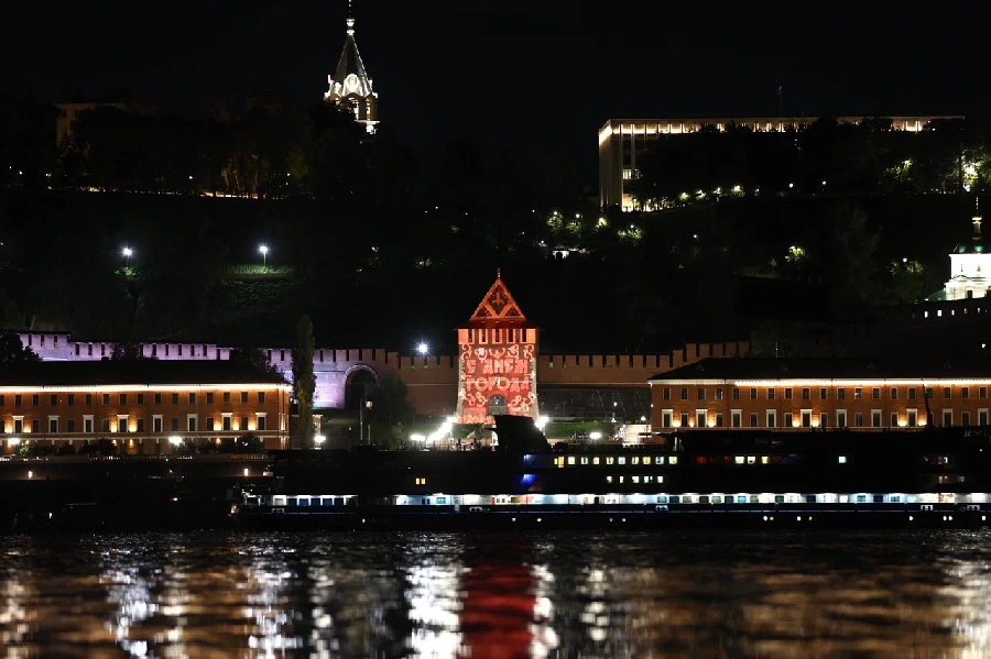 Козьма Минин и Дмитрий Пожарский - герои Нижегородской земли, собравшие народное ополчение в 1612 году, появятся в следующей сцене. Затем истории героев уступят место торжественному поздравлению горожан, эффектно исполненному на Зачатьевской башне в алых и золотых тонах.
