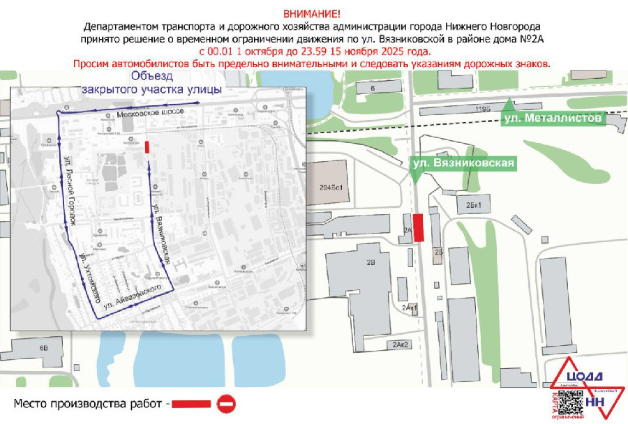 Движение транспорта будет временно ограничено по улице Вязниковской напротив дома №2А с 00.01 1 октября до 23.59 15 ноября. Объезд будет организован по прилегающим улицам.