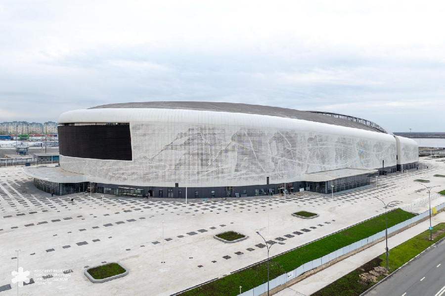 Внешний облик арены уже можно оценить со всех ракурсов. Главные образы графики — фигуры хоккеистов в моменты игры, запечатлённые будто бы в замедленной съёмке, изрезанный коньками лед, вихри снега и траектория полета шайбы.