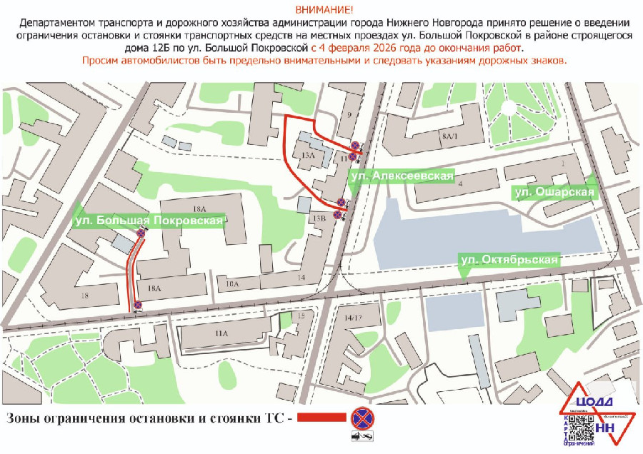 Ограничение вводится на остановку и стоянку транспортных средств на местных проездах улицы Большой Покровской в районе строящегося дома №12Б. Меры приняты для обеспечения беспрепятственного проезда большегрузных транспортных средств к строительной площадке до окончания работ.