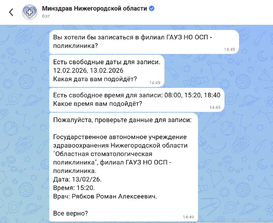 Региональный Минздрав и Нижегородская областная стоматология доработали чат-бот, через который можно записаться и к зубному врачу. Система даёт выбрать дату и удобное время.