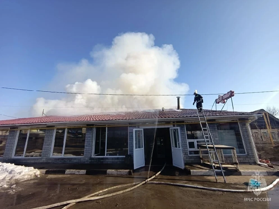 Горит кровля здания на площади 400 кв. метров в селе Богоявление, пострадавших нет, сообщает МЧС.