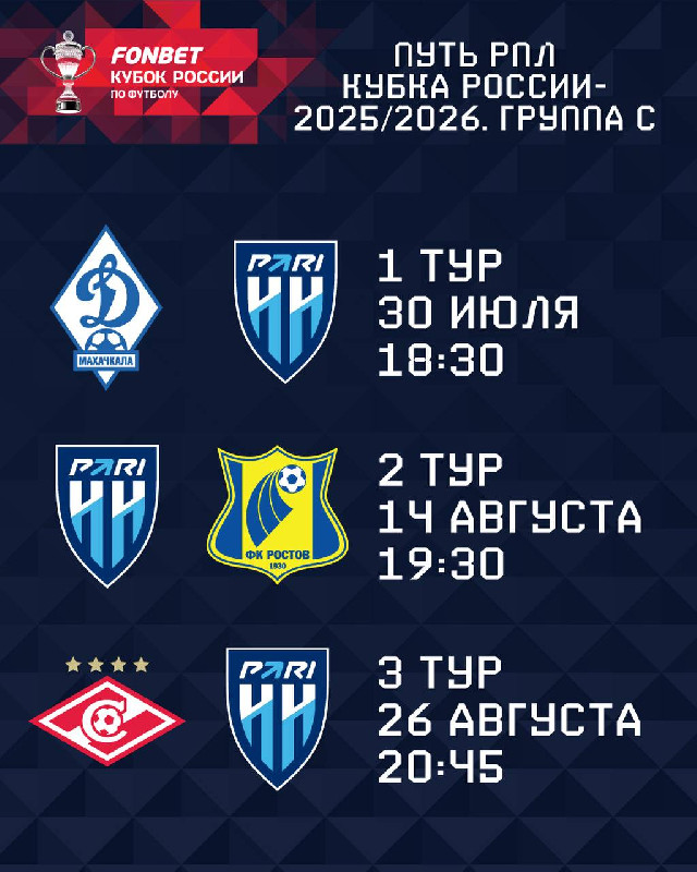 Футбольный клуб «Пари НН» в ходе жеребьевки в преддверие нового сезона Российской премьер-лиги попал в группу C. Соперниками нижегородцев будут «Динамо» Махачкала, «Ростов» и «Спартак».