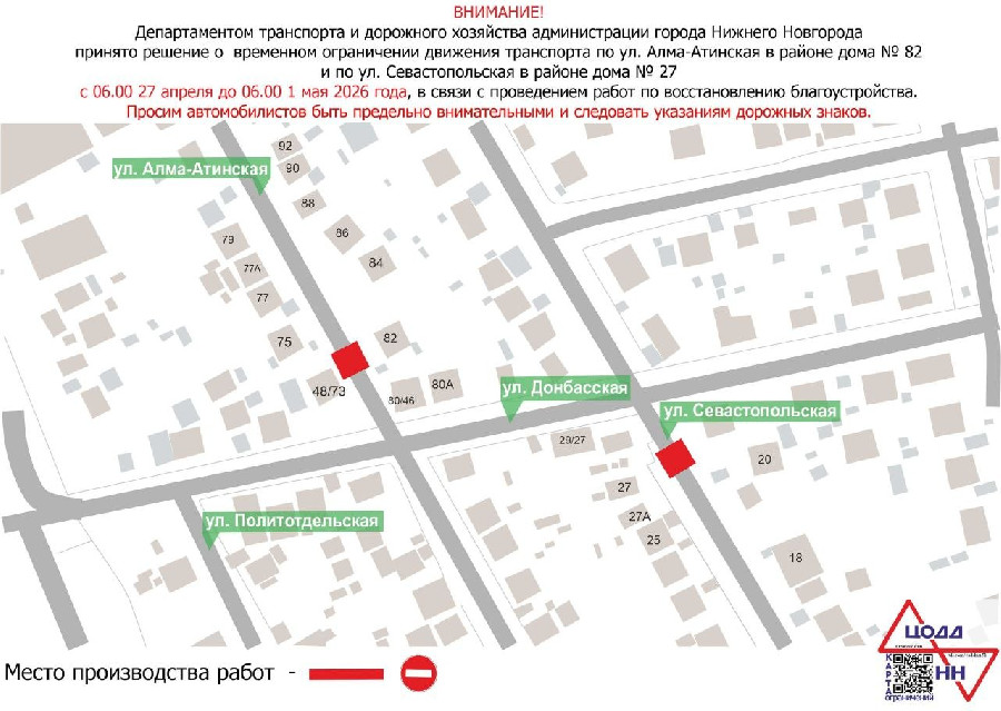 Перекрытия затронут: улицу Севастопольскую (в районе дома №27) и улицу Алма-Атинскую (в районе дома №82). Причина — работы после прокладки газопровода. Водителям рекомендуют заранее планировать маршрут.
