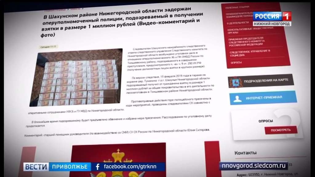 21 февраля 2019, ГТРК "Нижний Новгород" (видео).Сотрудника полиции подозревают во взяточничестве. Информация об этом появилась на сайте Следственного комитета.
