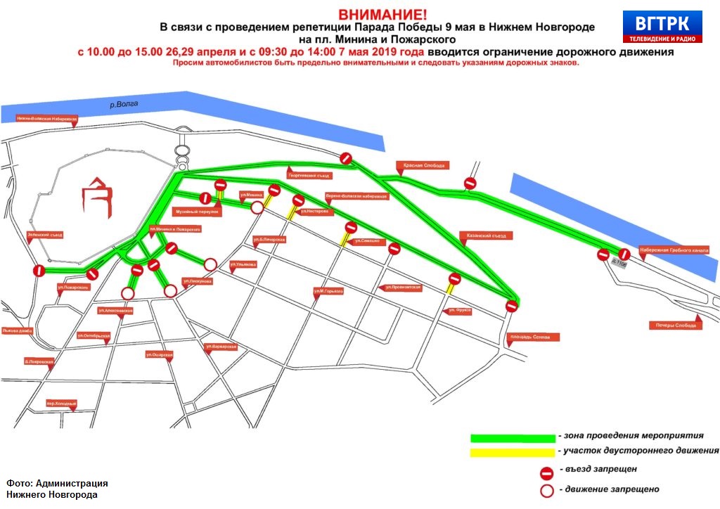 29 апреля с 10.00 до 15.00 временно прекратится движение транспорта по площади Минина и Пожарского (на участке от памятника В.П.Чкалову до улицы Большой Покровской), улице Ульянова, улице Варварской, ул. Минина, ул. Алексеевской (на участках от площади Минина и Пожарского до площади Сенной), Зеленском съезде (на участке от пл.Минина до улицы Зеленский съезд), по набережной Гребного канала (на участке от Георгиевского съезда до дома 110Б по улице Слободы Печеры).