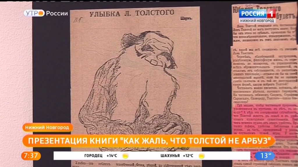 28 апреля 2019, ГТРК "Нижний Новгород" (видео). Праправнучка всемирно известного русского писателя Фекла Толстая презентовала нижегородцам свою новую книгу "Как жаль, что Толстой не арбуз".