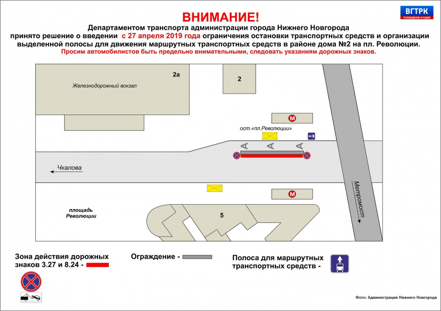 1 мая 2019, ГТРК "Нижний Новгород". Департаментом транспорта администрации Нижнего Новгорода принято решение о введении ограничения остановки транспортных средств и организации полосы для движения общественного транспорта в районе д. 2 на пл. Революции. Об этом сообщил заместитель главы Нижнего Новгорода Роман Колосов.