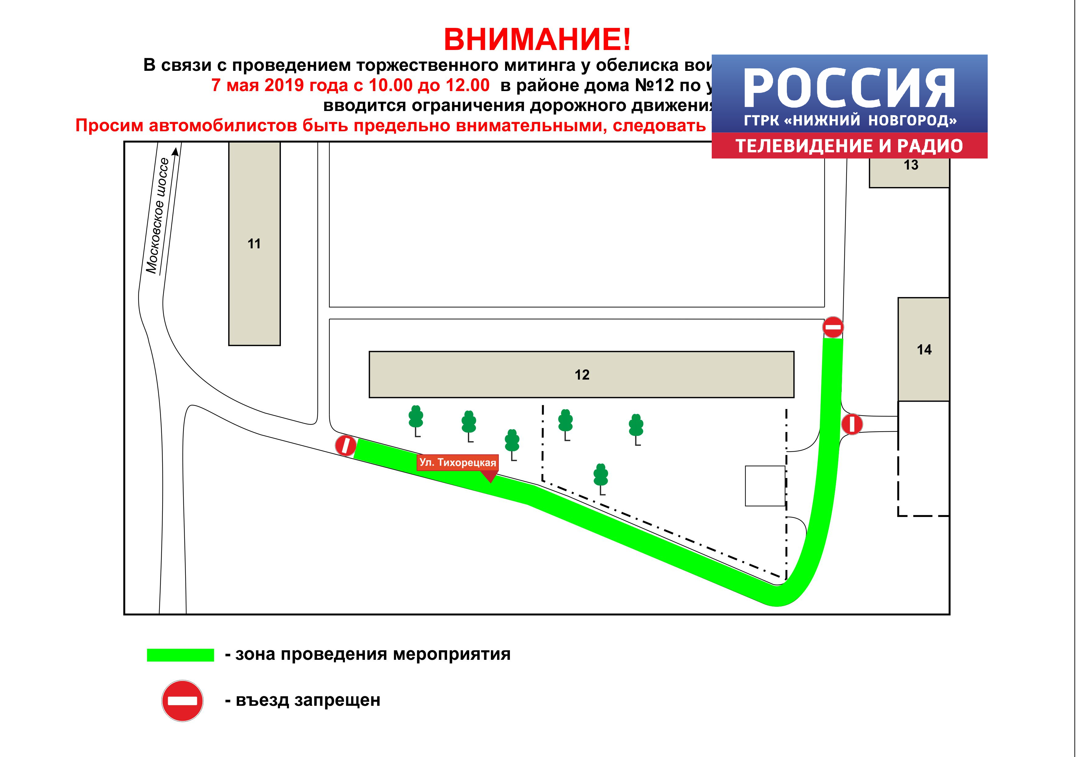 7 мая 2019, ГТРК "Нижний Новгород" . 7 мая с 10.30 до 11.30 временно прекратится движение транспорта по улице Тихорецкой на участке от дома 11 до дома 14. Об этом сообщает пресс-служба правительства Нижегородской области.