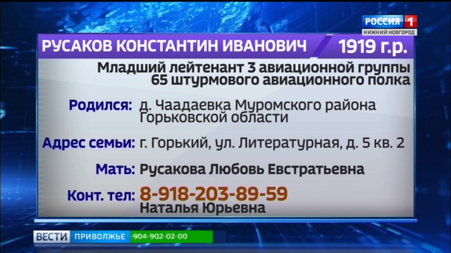 10 сентября 2019, ГТРК "Нижний Новгород" (видео). Поисковики ищут родных летчика-горьковчанина, погибшего под Ленинградом в начале Великой Отечественной войны. В Киришском районе Ленинградской области поисковыми отрядами подняты обломки самолета с останками летчика. Погибшим воином оказался уроженец Горьковской области Константин Иванович Русаков, 1919-го года рождения. До этого он числился пропавшим без вести. Установлено, что мать бойца Русакова Любовь Евстратьевна проживала в Горьком на улице Литературной. Но вскоре после войны она умерла, и дальше следы семьи теряются. Поисковики просят откликнуться родных Константина Ивановича или тех, кто знает о судьбе его семьи. Звонить можно по номеру 8-918-203-89-59 или по телефонам редакции программы "Вести-Приволжье".