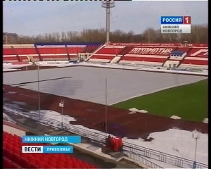 Стадион "Локомотив" в Нижнем Новгороде готовят к предстоящему матчу нижегородской "Волги" с московским "Динамо". С футбольного поля частично сняли укрывной влагостойкий материал - спанбонд.