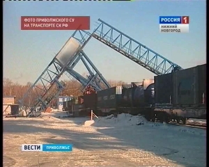 На фотографиях, предоставленных Приволжским следственным управлением на транспорте Следственного комитета России видно, что опора крана рухнула на товарный вагон.
