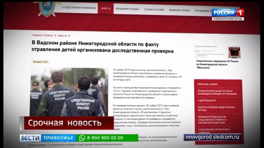 25 ноября 2019, ГТРК "Нижний Новгород" (видео). И срочная новость. ЧП в селе Вад. По данным следственного комитета следственного управления Нижегородской области сегодня в центральную районную больницу Вадского района было доставлено 32 человека, 29 из который школьники. В настоящее время пострадавшим оказывается медицинская помощь. Предварительно врачи диагностировали у обратившихся отравление газом.
