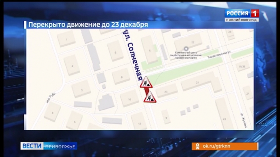 19 декабря 2019, ГТРК "Нижний Новгород" (видео). И еще о дорожных изменениях. С восьми утра завтрашнего дня прекратится движение транспорта по улице Солнечной - это Ленинский район - на участке между домами №№10 и 23. Там тоже пройдут плановые ремонтные работы. Но продлятся они целый месяц - до 19 января. Специалисты департамента просят водителей быть внимательнее на дорогах и следовать указаниям дорожных знаков.