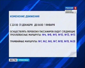 Также 31 декабря уходящего года будет продлена работа отдельных автобусных, трамвайных и троллейбусных маршрутов до 24.00 и увеличено в случае необходимости количество рейсов на маршруте. 1 и 7 января наступающего года, в связи с проведением на площади Минина и Пожарского новогодних программ, с 14 до 17 часов движение автотранспорта на участке от улицы Минина до Пискунова будет закрыто.