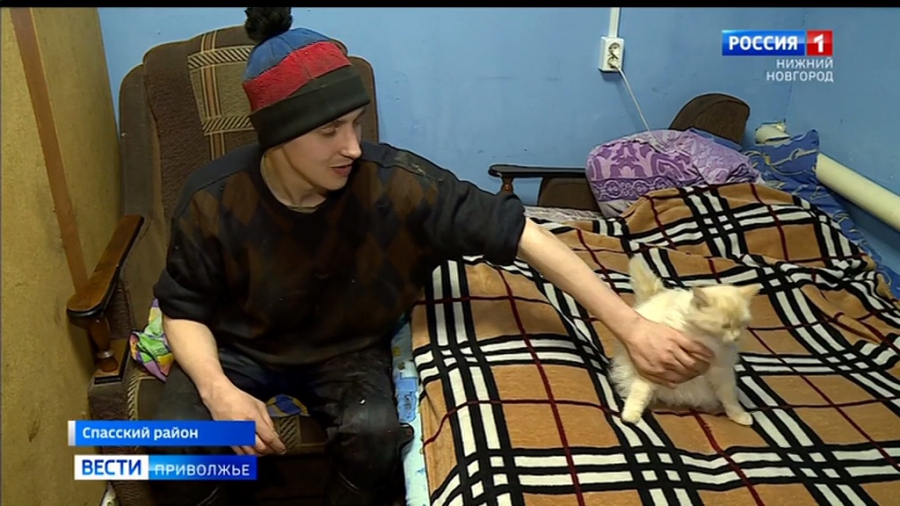 Это не комната Саши - здесь у него угол. Из хозяйства - кот и диван. Последние месяцы юноша ночует на ферме, где работает. Программист с образованием переквалифицировался в забойщика скота. У сироты нет своего жилья и регистрации, а значит и предложений от работодателей. После двух детдомов - в Спасском и Княгинине - и учебы в местном техникуме юноша оказался на улице. Временный кров и возможность заработать на хлеб сироте дала фермер РавилЯ Пирогова. Трудостроила официально.