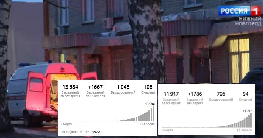 11 апреля 2020, ГТРК "Нижний Новгород" . Информационный центр по мониторингу ситуации с коронавирусом опубликовал последние данные о заболеваемости. За последние сутки общее число заразившихся увеличилось на 1 667 человек и составило 13 584 человек. Смертей - 106. Выздоровлений - 1045. Тестов на коронавирус проведено - 1,18 млн