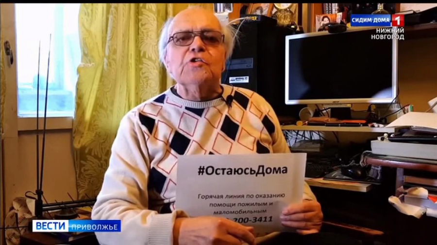16 апреля 2020, ГТРК "Нижний Новгород". Именитые пожилые люди Нижегородской области запустили акцию "Остаюсь дома". В своих видеообращениях они просят людей быть благоразумными, социально ответственными. В руках они держат табличку с призывом пользоваться помощью волонтеров. Указан и телефон, куда за помощью могут обратиться пожилые маломобильные граждане 8-800-200-34-11.