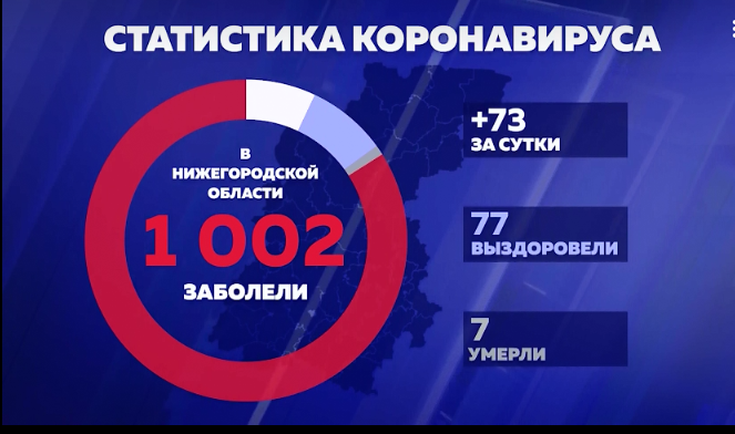 23 апреля 2020, ГТРК "Нижний Новгород". Количество заболевших новой коронавирусной инфекцией в Нижегородской области перевалило за тысячу человек. Сегодня зарегистрировано плюс 73 новых случая COVID-19, 1002 случая - в целом. По данным на этот час, уже 77 человек выздоровели и выписаны. Скончалось 7 пациентов.
