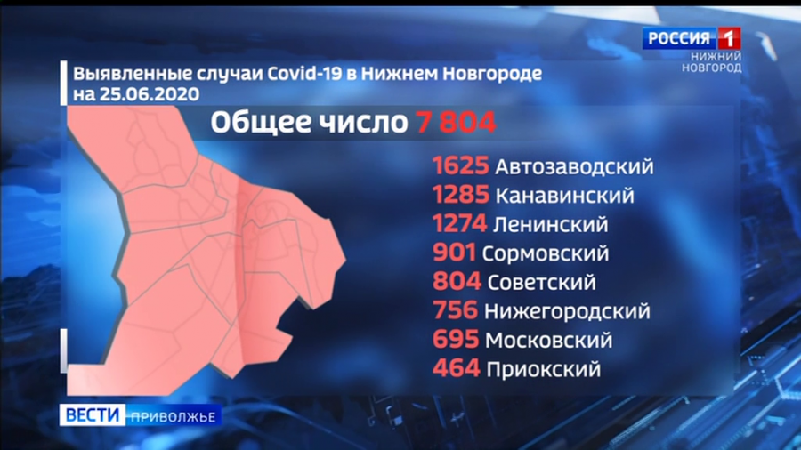 25 июня 2020 года, ГТРК "Нижний Новгород". Еще 97 жителей областного центра заразились коронавирусом за прошедшие сутки. Общее число подтвержденных случаев за весь период пандемии в столице Приволжья - 7804. Автозаводский район продолжает находиться на верхней строчке общего списка - 1625 человек. Следом - Канавинский и Ленинский районы - 1285 и 1274 подтвержденных диагнозов ковид-19. Приокский район остается самым безопасным - 464 человек.