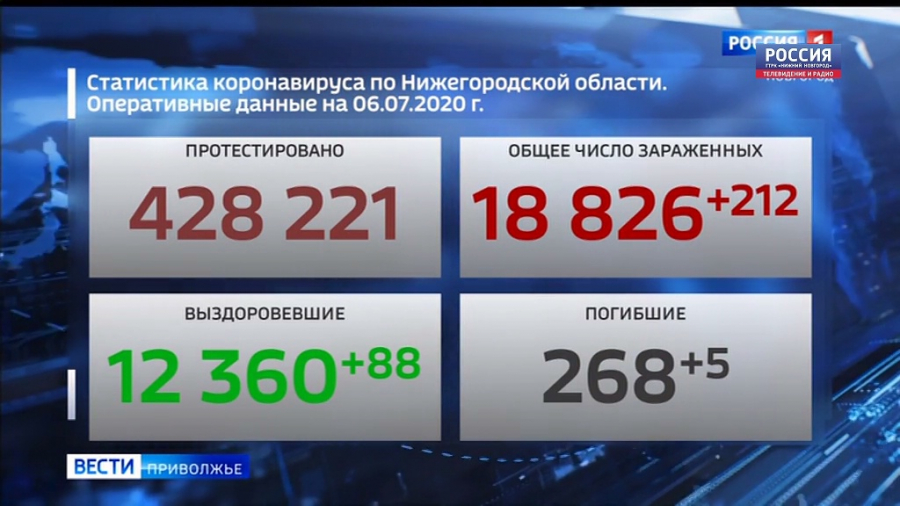 6 июля 2020 года, ГТРК "Нижний Новгород". По данным нижегородского регионального штаба на 6-ое июля в регионе подтверждено ещё 212 новых случаев заболевания коронавирусной инфекцией. Всего с начала пандемии зарегистрировано 18 826 подтвержденных случаев КОВИД-19. За прошедшие сутки выписаны и отправлены домой 88 нижегородцев. Общее число победивших болезнь - 12 360 человек. Ежедневно увеличивается и число проведенных тестов. На сегодня взято около 430 тысяч соответствующих анализов. Количество случаев с летальным исходом увеличилось на 5 и достигло 268 человек.