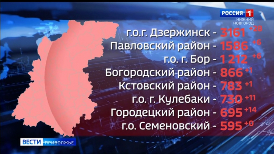 За прошедшие сутки в Дзержинске подтверждено ещё 28 новых случаев заражения. В Павловском районе и городе Бор по 6 зарегистрированных больных. По одному за сутки в Богородском и Кстовском районах. В Кулебаках сразу 11, а в Городецком районе 14 новых случаев.