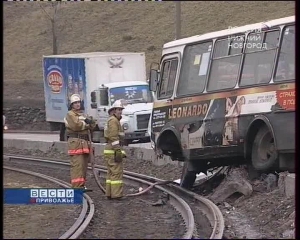 Серьезная авария произошла на Окском съезде в Нижнем Новгороде. Около 13.00 маршрутное такси №85, поднимаясь по съезду, вылетело на встречную полосу. При этом оно "зацепило" 2 легковых автомобиля марок "Форд Фокус" и "ВАЗ-2115". От удара автобус через бордюр вылетел на трамвайные пути.