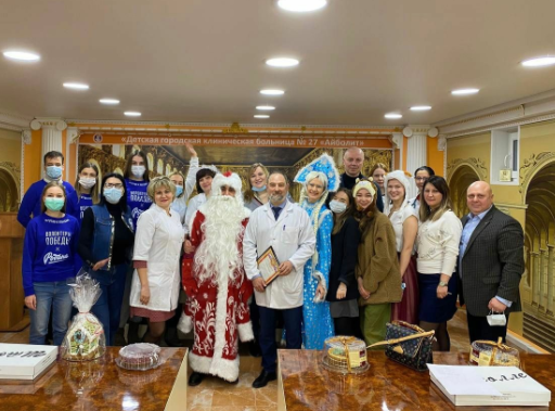 Волонтеры в костюмах Деда Мороза и Снегурочки вручили торты и пироги сотрудникам больниц и поздравили детей, проходящих лечение.