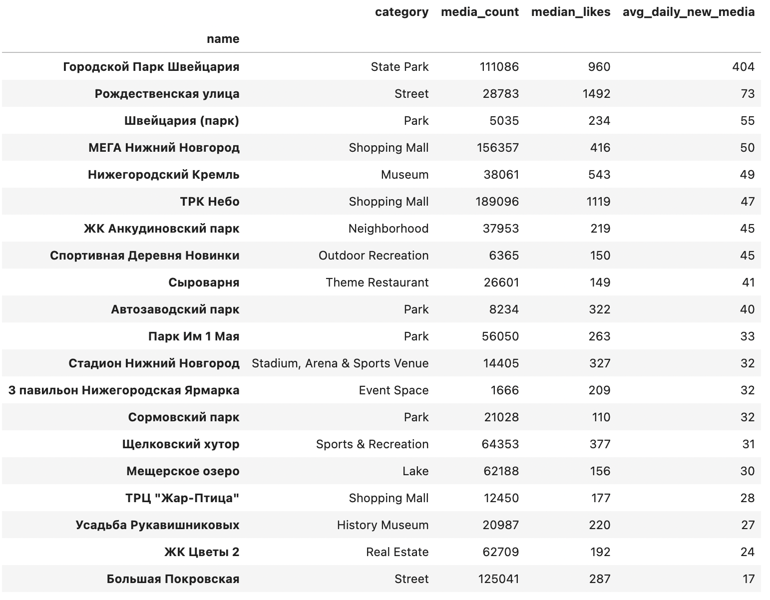 В Нижнем Новгороде по количеству новых постов с геотегами, выложенными в Instagram за сутки, на первом месте оказался парк «Швейцария» – 404. Улица Рождественская вторая в списке: за день было выложено 73 публикации. На третьей строчке оказался крупнейший торговый центр региона (50 постов). Нижегородский кремль разместился лишь на четвертом месте – 49 публикаций. Улица Большая Покровская заняла последнее место в рейтинге: с соответствующим геотегом в Instagram выложили всего 17 постов за сутки.