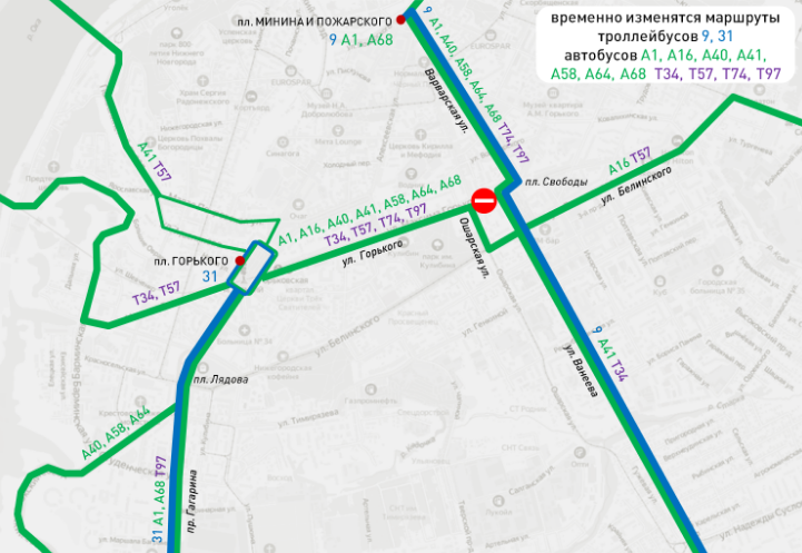 Ранее сообщалось, что из-за подготовки к строительству метро в марте будет сужена проезжая часть на улице Горького на участке от домов №105-107 до пересечения с улицей Решетниковской. Кроме того, закроют проезд на площади Свободы, а также участок улицы Большой Печерской от площади Сенной до автостанции «Сенная».