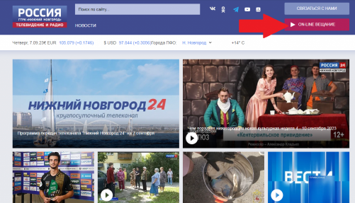 2. Найти в правом верхнем углу красную кнопку "On-line вещание"