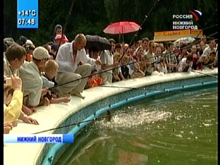Необычное соревнование в честь Дня рыбака прошло в автозаводском парке культуры и отдыха - кто поймает больше рыбы в фонтане. Организаторы праздника обещали, что клев будет и еще какой! Ведь накануне в фонтан запустили несколько десятков отборных карпов. Для того, чтобы стать участником соревнования, требовалось лишь наличие удочки.