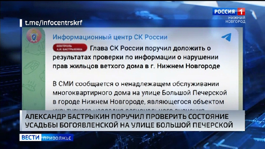 Глава Следственного комитета России Александр Бастрыкин взял на контроль ситуацию с разрушающимся в центре Нижнего Новгорода памятником истории. Речь идет об усадьбе Богоявленской на Большой Печерской. Несколько дней назад мы рассказывали о том, что объект культурного наследия регионального значения пребывает в крайне плачевном состоянии. Жители просят провести капитальный ремонт. И его уже даже запланировали, но самый ранний срок — это 2032 год. Александр Бастрыкин поручил сотрудникам регионального следственного комитета организовать процессуальную проверку и доложить о её ходе и результатах. Исполнение поручения — на контроле в центральном аппарате ведомства.