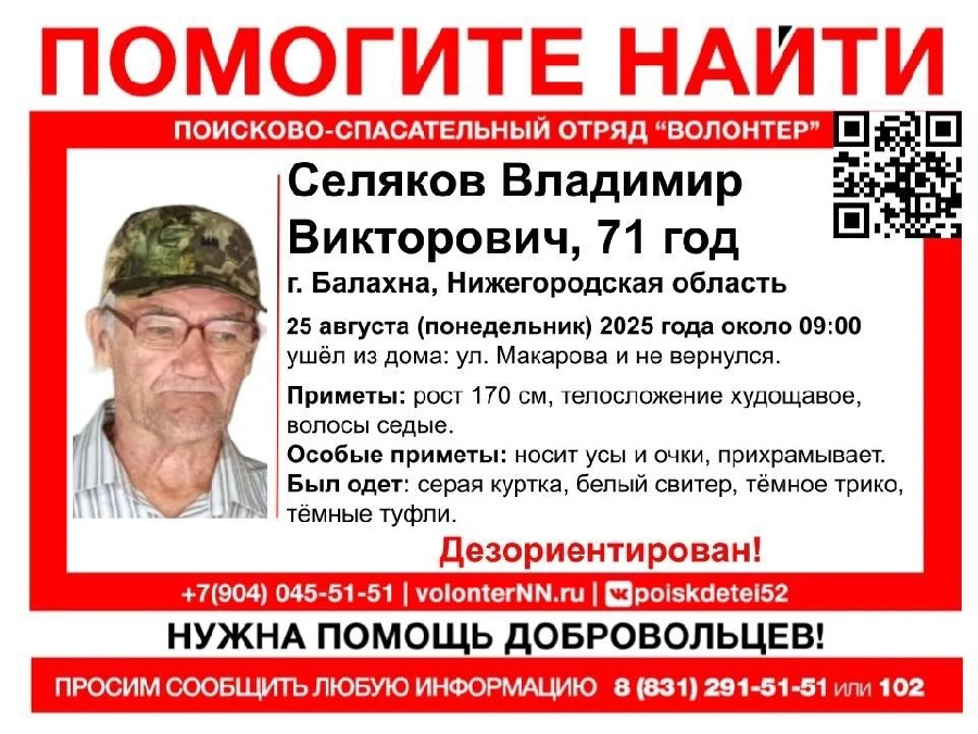 71-летний Владимир Викторович Селяков около 9 утра 25 августа ушел из дома в Балахне на улице Макарова и до сих пор не вернулся. За эти трое суток в выездах приняли участие около 100 человек — волонтёры, полиция, местные жители, родственники, добровольцы ДПСО «ЛизаАлерт» и кинологические расчёты РЭД – 52, ОНИКСС и ОНИКСС-старт. Были обследованы акватории, кладбища, просмотрены камеры видеонаблюдения. Однако ни одной подтверждённой зацепки пока нет. Если у вас есть какая-либо информация, сообщите её в отряд. Также очень важно, если у вас есть камеры в домах или учреждениях, предоставить записи за период с 25 августа — ориентировочно с 8:30 утра до настоящего момента.