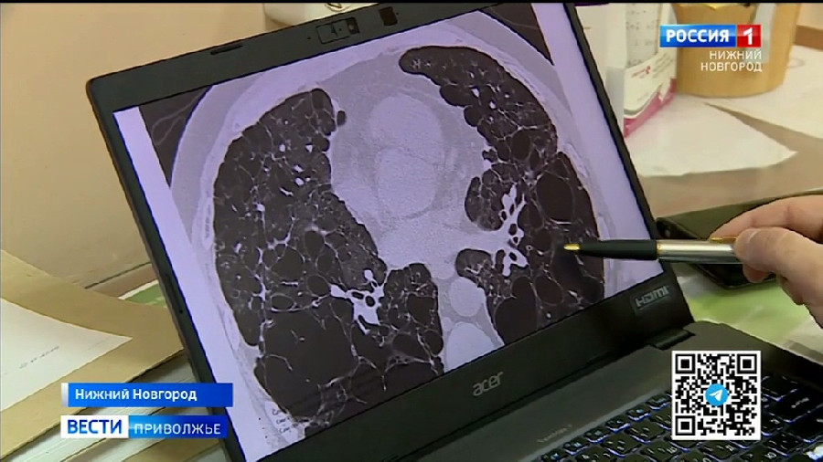 Видите, такие "кисты" — вот эти вот участки, дырки в лёгких, по сути дела. Здесь просто воздух. Это распавшиеся участки лёгкого на фоне длительного интенсивного курения у человека. Вот это, что серенькое — это оставшаяся лёгочная ткань.