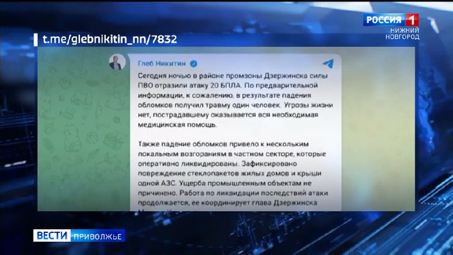 Один человек пострадал в результате падения обломков беспилотника. Этой ночью в районе промзоны Дзержинска силы ПВО отразили атаку 20 беспилотных летальных аппаратов. Об этом в своем телеграмм канале сообщил Губернатор Глеб Никитин. Как сообщает глава региона - Угрозы для жизни пострадавшего нет, ему оказывается вся необходимая медицинская помощь. Также, цитата: падение обломков привело к нескольким локальным возгораниям в частном секторе, которые оперативно ликвидированы. Зафиксировано повреждение стеклопакетов жилых домов и крыши одной АЗС. Ущерба промышленным объектам нет. Работа по ликвидации последствий атаки продолжается, ее координирует глава Дзержинска Михаил Клинков.