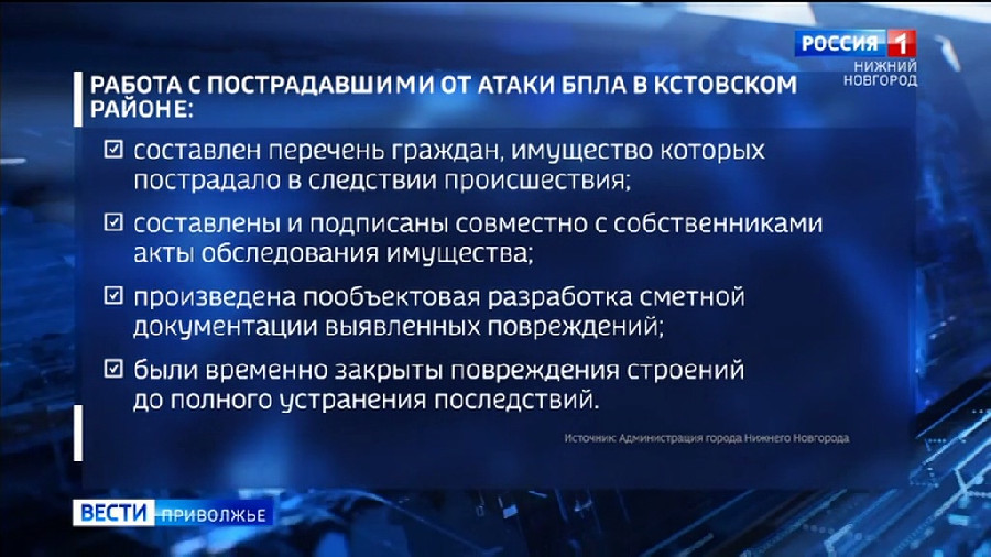 Жители Кстовского района просили ускорить восстановление их домов после падения обломков беспилотных летательных аппаратов. Глава Нижнего Новгорода Юрий Шалабаев поручил местной администрации оказать необходимую материальную помощь кстовчанам. Работа ведется со всеми жителями. Как сообщает администрация областного центра, в настоящее время чиновники составили список граждан, имущество которых пострадало в следствии происшествия, составили и подписали совместно с собственниками акты обследования имущества, для каждого объекта разработали смету для восстановления, а пока временно закрыли повреждения строений до полного устранения последствий.