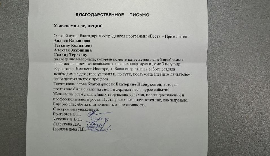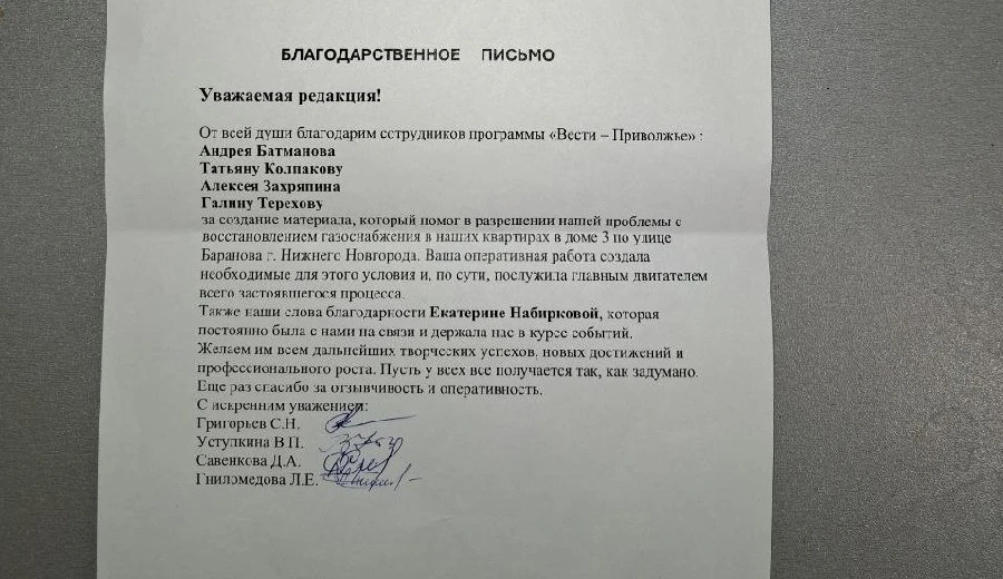 «От всей души благодарим сотрудников программы «Вести-Приволжье» за создание материала, который помог в решении проблемы с восстановлением газоснабжения в наших квартирах в доме №3 на улице Баранова. Ваша оперативная работа создала необходимые для этого условия и, по сути, послужила главным двигателем всего застоявшегося процесса.