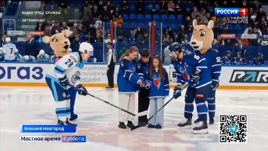Символическое вбрасывание перед матчем "Торпедо" - "Сибирь" выполняют подопечные фонда НОНЦ Соня Воронкова, Полина Пермякова и Кирилл Батраков. Позже, уже в перерыве матча, Соня — в роли корреспондента.