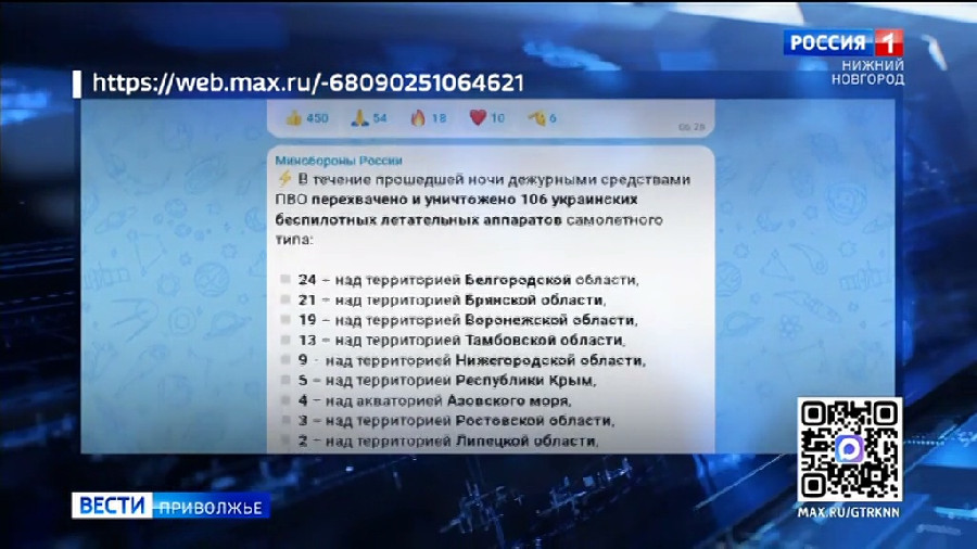 Сегодня ночью над территорией Нижегородской области средства ПВО сбили девять беспилотников