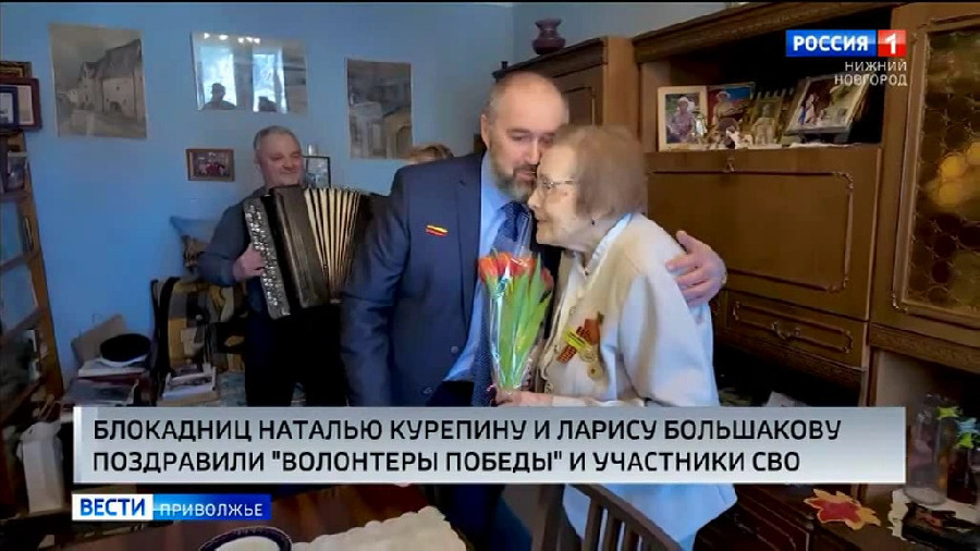 Наша съемочная группа застала активистов в гостях у блокадниц Натальи Курепиной и Ларисы Большаковой. Наталья Юрьевна жила в осажденном Ленинграде до самого снятия блокады, подростком дежурила в госпиталях. Сейчас, несмотря на свои 95 лет, возглавляет Нижегородскую организацию "Жители блокадного Ленинграда". Первые дни в осажденном городе провела и Лариса Большакова. В 42-м, в возрасте трех лет, ее вывезли в эвакуацию в Городец. В подарок блокадницы получили цветы, приятные подарки и, самое главное, внимание.