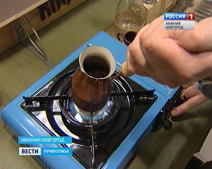 АЛЕКСАНДР СУРИН, УЧАСТНИК ВСЕМИРНОЙ АКЦИИ "РЕСТОРАННЫЙ ДЕНЬ": "У нас уже есть опыт в приготовлении кофе, на двоих он немного больше. Есть машина, которую мы оформили под фургон. Сначала мы ездили по нескольким точкам, нам хотелось посмотреть как живет Нижний Новгород в ресторанный день. Поскольку сейчас похолодало, мы решили "Кофемашину" привести в танцевальную студию".