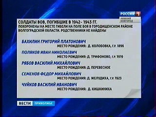 Откликнулись 3 семьи, но 5 до сих пор так и не знают, где похоронены их родственники, отдавшие свои жизни на Великой Отечественной войне. Журналисты программы "Вести - Приволжье" неоднократно рассказывали о поисковике из Иванова, который нашел братскую могилу солдат, погибших в боях под Сталинградом. Захоронение на 3,5 тысяч человек, среди которых был его отец и, как выяснилось, 16 призывников-горьковчан. Все они считались без вести пропавшими.